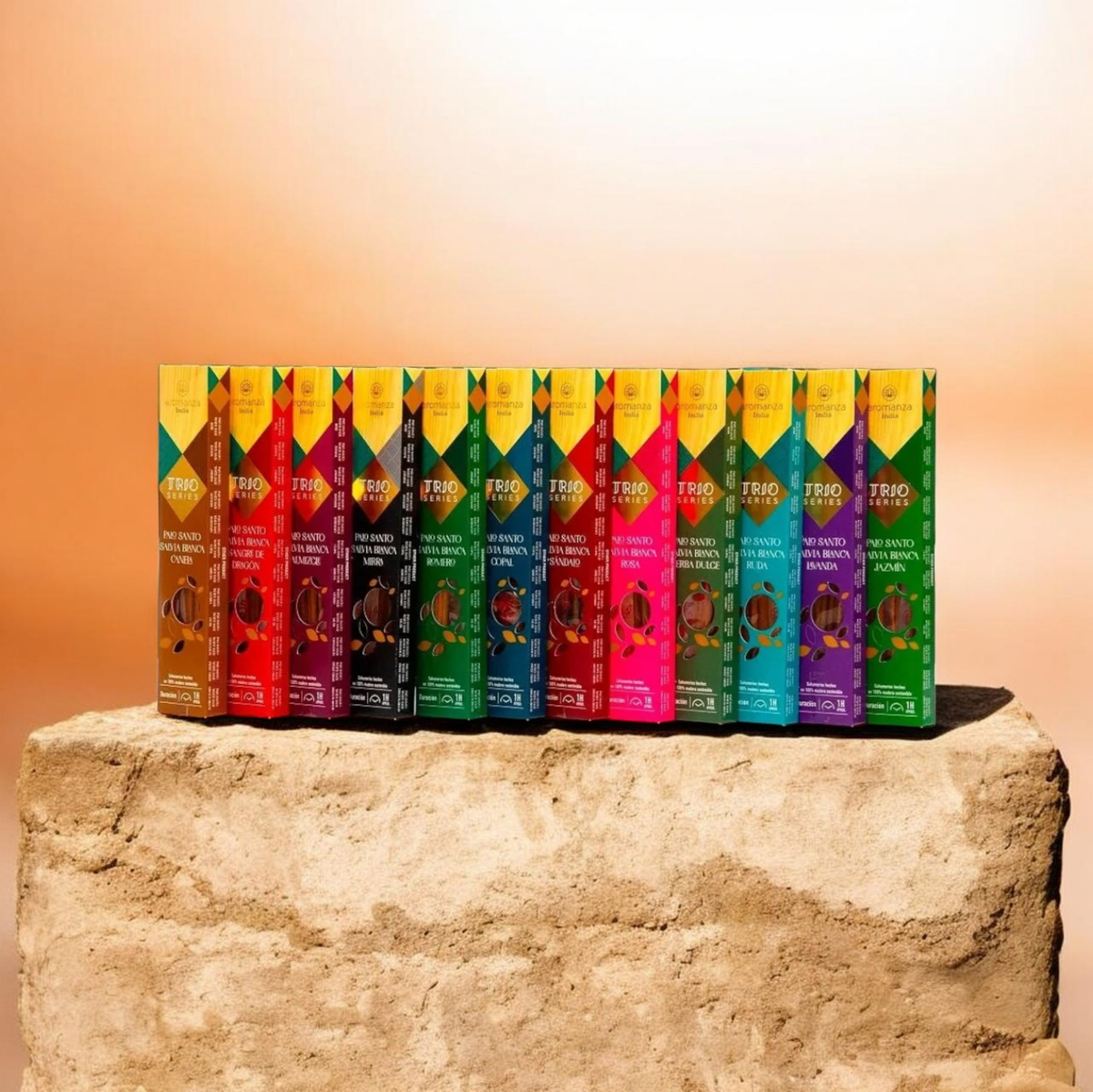 SAHUMERIOS QUE COMBINAN PALO SANTO, SALVIA Y UN AROMA DISTINTO SEGÚN LA VARIANTE. INGREDIENTES REALES, PARA UNA EXPERIENCIA NATURAL Y AUTÉNTICA.